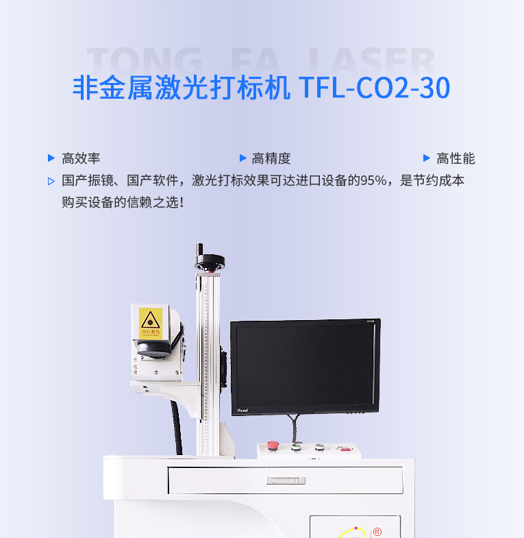 通發激光研發TFL-CO2-30非金屬激光打標機,是皮革激光打標、木材激光打標、石材激光雕刻、硅膠激光鐳雕等非金屬專用的二氧化碳激光鐳雕設備,本二氧化碳激光鐳雕機配置進口射頻激光器等高端器件,性能穩定!!!
